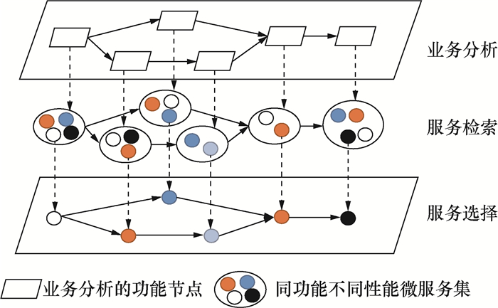 对微服务的绑定即是一个微服务组合的过程,应当先对微服务库进行服务检索,再进行服务选择。具体流程为:根据用户的业务需求得出相应的业务流程,业务流程的一个功能节点对应一个微服务;然后从微服务库中选出满足功能需求的候选微服务集,此为服务检索环节;再从微服务集中选出满足整个业务流程非功能需求的最优微服务组合,此为服务选择环节。服务组合流程图如图 2所示。