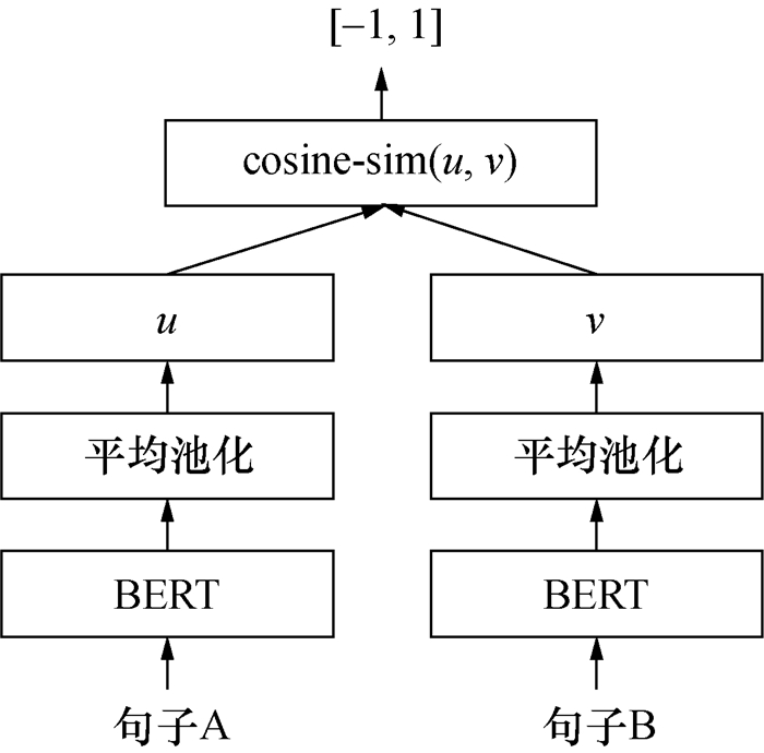 基于转换器的双向编码表征(bidirectional encoder representation from transformers,BERT)模型是一个预训练的语言表征模型,一经提出,大大提高了各项自然语言处理(NLP)的测试结果,但BERT模型在文本语义相似度等句子对的回归任务上需要把2个句子同时送入网络,这样会导致巨大的计算开销。Sentence-BERT模型是在预训练BERT网络上增加了一个平均池化(mean-pooling)的策略,从而生成一个固定维度的句子嵌入,如图 3所示,其中u和v分别是句子A和B的表征向量,计算它们的余弦相似度在-1到1之间。该模型使用孪生(siamese)或三元组(triplet)网络结构来更新权重,进而推导出语义上有意义的句子嵌入,大大减少了计算工作量,更适合文本相似度度量、语义搜索、语义聚类等任务[11]。