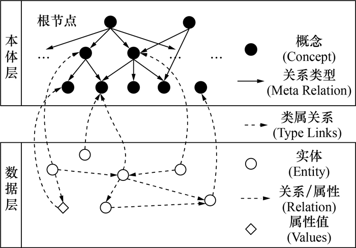 1.2 领域知识结构分析领域知识以结构化的图谱形式进行表征。其中:本体层结构组织性好、规模较小,其构建依赖于领域核心概念与关系体系的扩展;数据层结构组织性稍差、连接性强,需要基于海量文本数据进行提取。