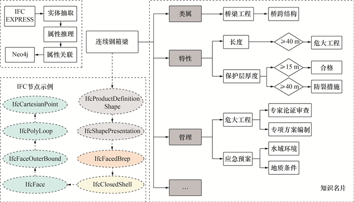 知识名片可以进一步与工业基础类(industry foundation classes, IFC)文件经过处理后得到的知识库实现关联,以服务于项目安全管理应用场景。该部分不作为本文的重点,其主要步骤与效果示例见图 11。