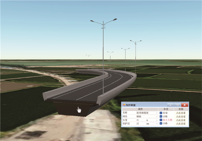 4.3 公路工程项目安全管理应用场景基于知识名片形式的智能化搜索结果,本研究面向智能化风险管控场景,展示知识图谱应用于公路工程安全管理的效果,借助知识模型和BIM的本体关联,实现基于知识图谱的安全审查功能。以下基于中江高速公路改扩建项目立体交叉桥梁的BIM实例进行展示说明。