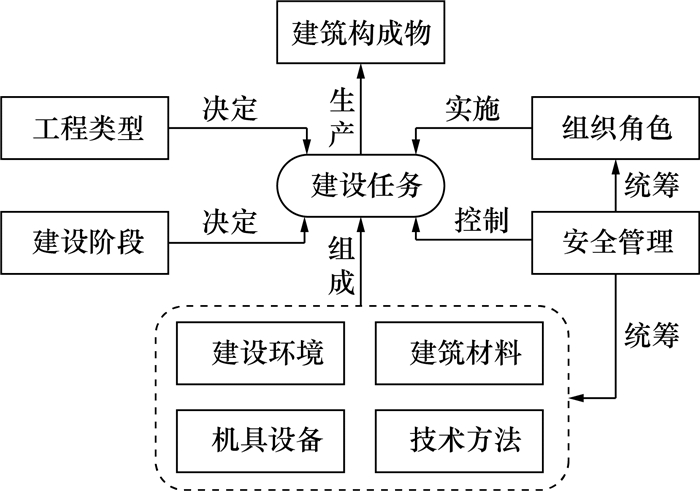 根据公路工程安全管理的运作模式,本研究得到该领域的核心概念与关系框架,如图 2所示。对于特定的建设任务,建筑构成物是生产目标,其性质由工程类型、建设阶段所决定;人是实施主体,机械、环境、材料、工艺是重要组成;而安全管理的过程则统筹人、机、环、法、材,对建设任务进行宏观控制。这个框架可作为知识架构的底层逻辑和基础,同时也是公路工程安全领域的核心概念与关系体系。从该体系可以衍生、扩展出多维度层状分类的本体层,继而引导知识图谱的构建和组织。