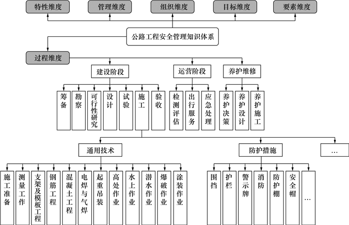 基于领域的核心概念与关系,本研究以多维度分类的方式建立公路工程安全领域的知识架构;进一步借助文献调研、规范阅读来总结领域的概念体系,对知识架构进行层状扩展,得到领域的多维度层状分类知识体系,用作知识图谱的本体层。参考图 2所示的核心概念与关系框架,本研究将公路工程安全管理知识体系划分为6个维度:特性维度、过程维度、管理维度、组织维度、目标维度、要素维度。