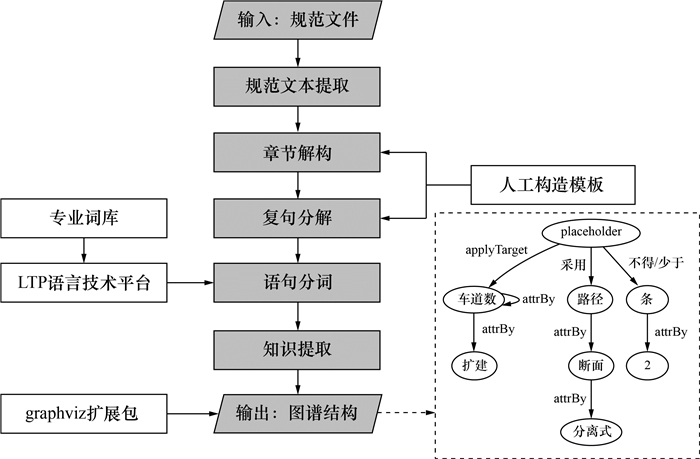基于本体层的引导作用,本研究设计了自然语言处理算法,从海量规范文本数据中提取公路工程领域的安全知识,作为领域知识图谱的数据层。图 4展示了以语句为单位进行知识提取的算法流程:输入规范文件后,依次进行规范文本提取、章节解构、复句分解、语句分词、知识提取等操作,将文本内容拆解为〈实体,关系,实体〉三元组形式的知识结构。在此流程中,本体层的多维度知识分类体系作为知识提取的指导性字典,导入语言技术平台(language technology platform, LTP)[20],使语句分词得到的实体名词契合本体层中的节点。