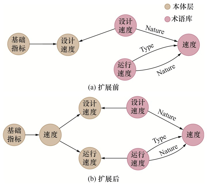 图 7展示了利用此方法实现本体层扩展的实例。如图 7a所示,术语“设计速度”匹配至本体层“基础指标”下的“设计速度”子类,又与术语“运行速度”提取到相同的“Nature”,即“速度”,继而2个术语自动归为“速度”子类。将溯源结果更新至本体层,形成了如图 7b所示的新连接。