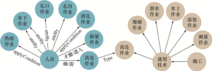 图 9展示了此方法的应用实例。对于数据层“人员”关联的实体,可依据核心词“*作业”将“高处作业”“水下作业”“箱梁作业”等众多名词进行聚类,形成实体集。其中,“高处作业”同时作为“通用技术”的子类关联至本体层,由此可将实体集中的其他对象亦关联至“通用技术”的子类,实现本体层的同级扩展。