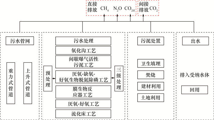 温室气体排放引发的气候变化已对地球系统造成巨大影响[1]。城市是温室气体排放的主要区域,仅城市污水处理环节的温室气体排放量便占全球温室气体排放总量的1.5%左右,是城市第5大温室气体排放源[2]。如何实现污水处理系统的低碳运行已经成为城市治理的重大挑战。中国是世界上污水排放规模最大的国家[3],根据2021年国家发改委、水利部等十部委出台的《关于推进污水资源化利用的指导意见》,未来一个时期中国污水排放规模、处理标准、回用程度还将明显提升。平衡污水处理规模上升和更严格的出水要求导致的温室气体排放增加[4],与全社会2030年碳达峰、2060年碳中和目标的关系,对中国城市可持续发展具有重要的现实意义。