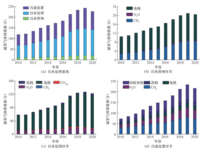 2.2 2010—2020年北京市污水处理系统温室气体排放2010—2020年北京市污水处理系统及各环节的温室气体排放量如图 3所示。2010—2020年北京市污水处理系统排放的温室气体(以CO2e计,下同)从119.13万t增加至226.91万t,呈明显上升态势,年均增幅为6.03%。污水处理是温室气体排放最多的环节,平均占比为51.27%,11年间污水处理环节的温室气体排放增幅达到109.60%。污泥处置是第2大排放环节,温室气体排放量平均占比为39.92%,排放量从2010年的50.25万t增长至2020年的84.20万t,增长了67.56%。污水管网的温室气体排放占比较小,仅为8.81%,但其增速较快,从2010年的10.55万t增长至2020年的20.45万t,11年间增长了93.84%。
