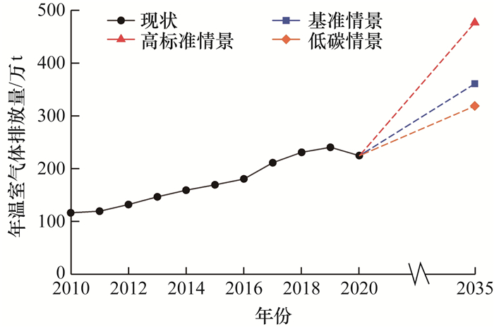 3) 低碳排放情景。考虑到2030年碳达峰、2060年碳中和的战略目标要求,假设未来北京市所有污水处理厂都采用平均温室气体排放强度最低的AAO工艺,污水处理规模与基准情景一致。