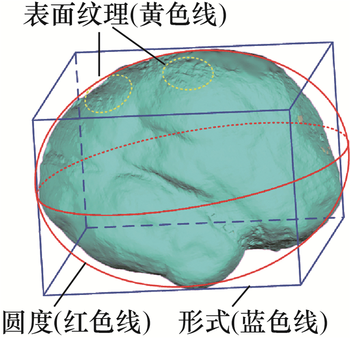 现有研究中,被广泛认可的形态学表征层面分为3个:形式、圆度和表面纹理[6]。这3种属性本质上是独立的,因为其中1种属性可在不影响其他2种属性的情况下发生很大变化。