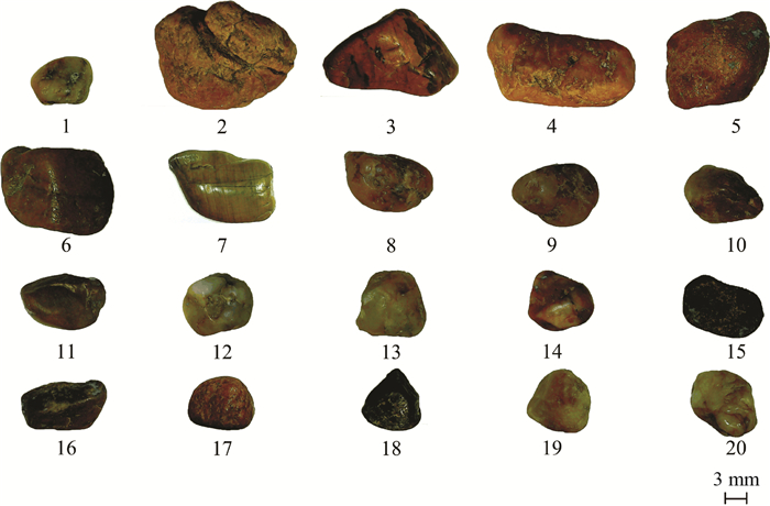 本试验使用的砂粒材料为天然砂粒,取自苏通特高压综合管廊工程经过的长江河床底部(北纬31°41′,东经120°46′)。在研究形态特征的砂粒数量方面,文[17, 23]曾采用超过20个的砂粒作为试验样本。在形态方面,能够进行三维重建的砂粒最小尺寸一般与三维测量装置和测试方法有关[24]。本文中,三维激光扫描装置需在对砂粒粘贴标记点后进行扫描,因此能够重建的最小砂粒尺寸约为5 mm。随机选取20个天然砂粒试验样本,其尺寸特征和形状特征分别如图 2和3所示,图 3中砂粒长、宽、厚为砂粒最小包容长方体的三维度尺寸。