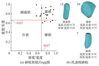 | 图 3 砂粒形状分布及3种形状的代表性砂粒 |
