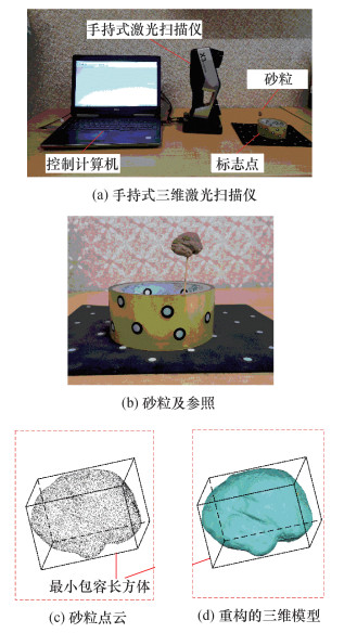 为精确获取砂粒的三维信息,采用手持式三维激光扫描仪(型号为:FreeScan X3)获取点云信息,试验时以0.02 mm的最大分辨率(即2个相邻点之间的最小距离为0.02 mm)捕捉砂粒外表面的空间点云,如图 5所示。实现砂粒的全方位扫描需要参照,而砂粒表面无法粘贴标志点,因此使用图 5b中的胶带及标志点作为参照。试验过程中,操作人员手持扫描仪进行全方位扫描以获取砂粒点云信息;之后将所获得的点云数据导入算法,将点云重构为三维模型,并自动计算砂粒的三维信息。该方法方便快捷,且无人工计算误差。
