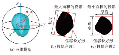 实际中,任意一张图像的拍摄均可看作是对物体某一角度的投影,为将这一思想应用到砂粒的形态表征中,本文采用对重构的三维模型进行任意角度投影的方式获取砂粒的二维图像,如图 6所示。O-XYZ坐标系为点云数据构成的最小包容长方体对应的参照系统,法向量n代表砂粒的投影方向,改变角度参数φ(n与Z轴的夹角)和θ(n与水平面的夹角),便可实现对砂粒模型不同角度的投影。所得投影的二维尺寸和形状参数可由算法自动计算,主要表征参数如表 2所示。