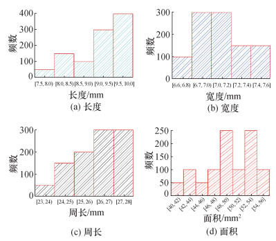 2 结果与讨论 2.1 多角度投影砂粒的每一张二维图像均可视作三维实体某一角度的投影,因而角度的不同往往会影响该砂粒信息的表征效果。为检验从不同方向投影同一颗砂粒所得图像计算得到的二维参数的差异性,每颗砂粒均基于算法进行了1 000个不同角度的投影。图 7为砂粒1的1 000个投影的长度、宽度、周长和面积的频数分布图。可以看出,不同角度的二维参数存在较大差距,尤其是面积参数,最大和最小投影面积误差高达40%。二维参数在不同投影面表现出的差异性也说明任意单一角度的砂粒投影所得的参数具有随机性,并不能获得准确的三维形态参数,因此,多角度投影对砂粒的三维形态表征非常重要。