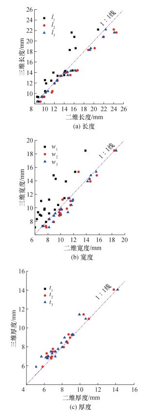 2.3 基于二维参数的砂粒三维形态表征及验证砂粒的三维形态参数与相应的二维形态参数之间具有较好的相关性,因此建立基于二维形态参数的砂粒三维形态表征是可能的。基于扫描及投影获取的砂粒二维、三维形态参数,建立了三维形态参数估算公式,如表 3所示,包括尺寸参数和形状参数。投影不具有厚度,因此t1和f12D无法通过随机单一投影法获取。从尺寸参数的线性拟合系数R2为0.735~0.994可知,砂土颗粒的三维尺寸(长、宽、厚)可使用相应的二维尺寸估算。对比R2可知砂粒尺寸参数的拟合效果普遍远优于形状参数的拟合效果;此外,最大最小投影面积法和三正交方向投影法的拟合效果远优于随机单一投影法的拟合效果。