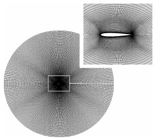 1.1 网格无关性验证选用NACA-0012结构网格完成网格无关性验证,O形拓扑翼型结构网格划分如图 1所示。在翼型周围及后缘对网格加密,翼型弦长1 m,壁面无滑移边界条件。给定远场边界条件:Ma为0.15,Reynolds数(Re)为6×106,环境温度T为288 K,湍流强度为0.02,湍流/层流黏度比为50。第1层网格高度为4.6×10-6 m,网格增长率为1.15,控制第1层网格高度,确保y+数小于1。在尾缘吹气的定常计算中,本文使用的压力远场距离为15倍弦长,与文[33-34]的相应数据相比,足以满足计算条件。使用Realizable k-ε湍流模型进行网格无关性分析,网格总数分别为粗网格15 680、中网格33 201、细网格59 302。对比3种网格的计算结果,并与NASA实验数据进行比较,不同网格密度的数据对比如表 1所示。粗网格下相对误差已收敛,中网格、细网格的计算结果趋于稳定,故选用中网格的计算方案[34]。
