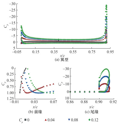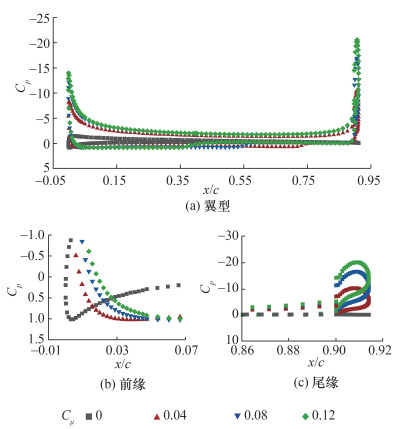 | 图 11 不同动量系数的翼型、前缘、尾缘压力分布 |