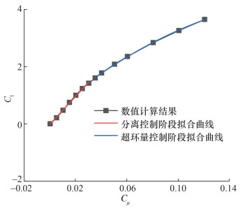 综上可知,翼型尾缘的射流偏转是环量控制翼型增升的主要原因,Coanda偏转角造成的外流场流线弯折相当于翼型弯度增加,并实现了环量可控。对比传统识别环量控制阶段的方式,Coanda偏转角可以作为准确判断控制状态是否进入超环量控制阶段的新途径,且具有较高的拟合精度。
