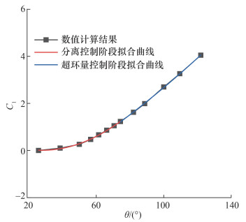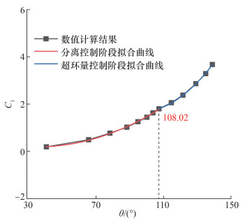 α=0°时NACA0012修型翼型升力系数随Coanda偏转角的变化如图 13所示。对比图 12和13可知,Cl-Cμ曲线在Cμ为0.03~0.04时从线性区域过渡至二次曲线区域,较难捕捉控制状态的转变位置。但由图 13中Cl-θ曲线可以发现,分离控制阶段和超环量控制阶段均为二次曲线,在θ=108.02°附近有一个较明显的转折点,此后控制状态进入超环量控制阶段。