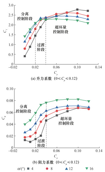 3) 在非0°攻角下引入受射流影响的“台阶区”,通过定量分析探究了4°、8°、12°、16°攻角下射流影响区位置与动量系数的强线性关系,尾缘大面积分离导致阻力激增,升力增长出现损失。