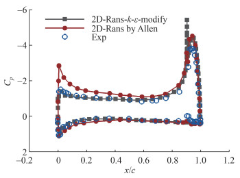 本文选用Spalart-Allmaras(S-A)、Realizable k-ε和剪切应力输运(shear stress transport, SST)k-ω共3种模型,计算条件为Ma=0.15,Re=6×106,与NASA实验数据对照。3种湍流模型在不同攻角α下的升阻力特性如图 2所示。图中Cl为翼型升力系数,Cp为压力系数,x、y为横、纵坐标,c为弦长,x/c表示横坐标在弦长上的相对位置,y/c表示纵坐标在弦长上的相对位置,本文c=1.0 m。