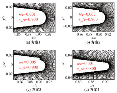 2 尾缘修型方案 2.1 翼型几何简化本文使用NACA-0012翼型作为环量控制的基础翼型,采用上翼面单边吹气的尾缘修型方案,探究环量控制翼型喷口高度与后缘半径比h/r及后缘半径与弦长比r/c对升力阻力增量的影响[40]。改变环量控制翼型尾缘的射流喷口位置和高度,探究Coanda效应的产生机制。4种修型方案的参数设置如表 2所示,其中射流喷口在翼型弦长上的相对位置表示为xjet/c,喷口高度在翼型弦长上的相对长度表示为h/c。图 5为设计后的4种修型方案中尾缘的翼型网络。图中,y/c表示纵坐标在弦长上(本文中c=1 m)的相对位置。