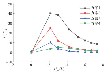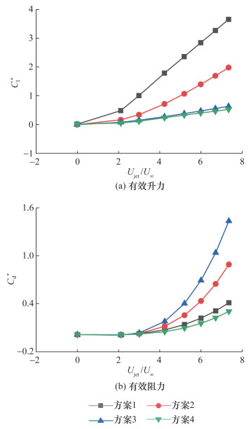 2.3 有效气动特性分析为验证尾缘修型方案的有效性,绘制不同修型方案下有效升力和阻力随Ujet/U∞的变化曲线,如图 6所示。可以看出,方案1的有效升力远大于其他方案,方案2居中,方案3和4均较小,说明方案1的增升效果最好;方案3的有效阻力增幅最大,方案2居中,方案1和4的有效阻力增幅最小,可推断方案1的能量消耗最少、阻力项最小。由上述结果初步判断:喷口高度越小,有效升阻比的适用范围越广、气动特性越好,方案1的增升减阻效果越好。