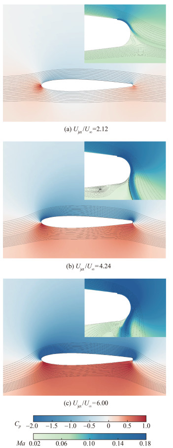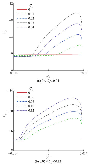 由图 8可知,翼型上翼面压力减小、下翼面压力增大,射流与附壁表面分离后穿透流场。壁面边界层速度亏损与喷口后缘附近的不利压力梯度相互作用,导致α不变的情况下来流流场中近翼面的流线产生较大偏转,相当于传统机械装置的气动弯度增加。附壁分离与射流穿透结合将使后部移动下表面上的驻点向前移动,下表面上的后缘驻点向前移动。随着射流速度增加,停滞点相互靠近,环量增大。