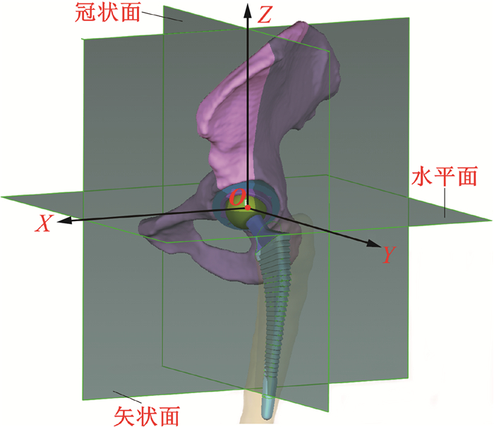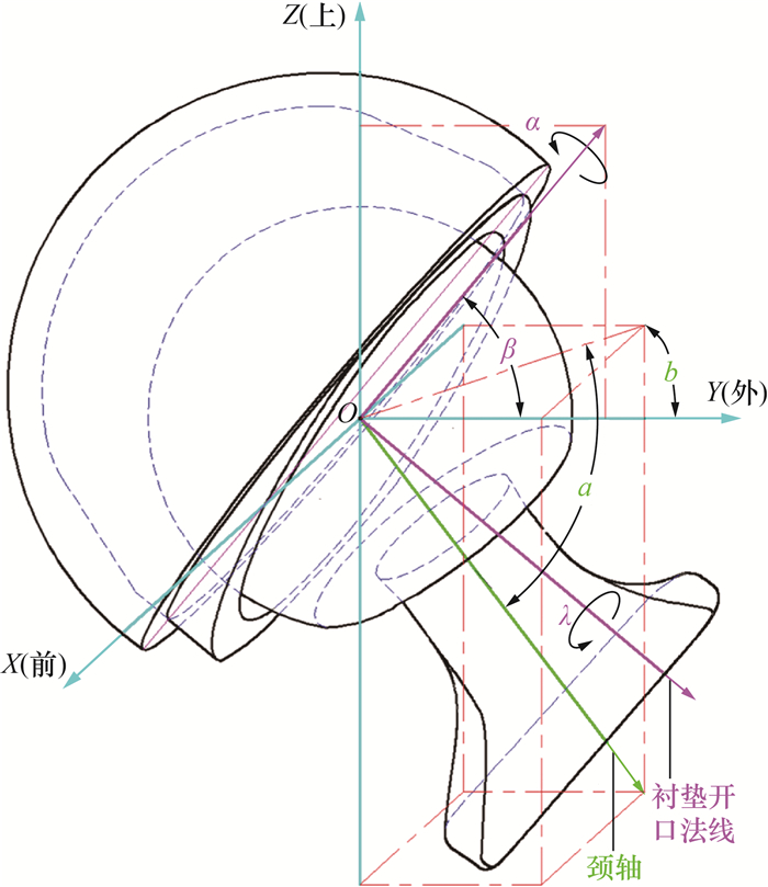 1 研究方法和材料 1.1 坐标系和假体参数的定义利用人体左侧髋关节作为研究对象并在站姿状态下建立坐标系,如图 1所示。以髋关节的旋转中心作为坐标系原点,假设在初始位置时,髋关节衬垫的旋转中心和球头旋转中心都与坐标原点重合,X、Y和Z轴的正方向分别为人体的正前方、正左方和正上方。臼杯和衬垫的位置采用影像学定义,Murray[17]从影像学和手术学定义的角度相互转换关系进行了阐释。图 2中,高边衬垫的位置由臼杯影像学外展角α、臼杯影像学前倾角β和高边绕衬垫绕开口法线的旋转角λ确定,当α=β=λ=0时,高边位置偏向Y轴正方向。颈干的位置由颈干外展角a和颈干前倾角b确定[17]。