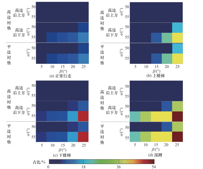 | 图 10 高边衬垫和平边衬垫在4种步态下(考虑所有安装位置)出现边缘负载的时间占比 |
