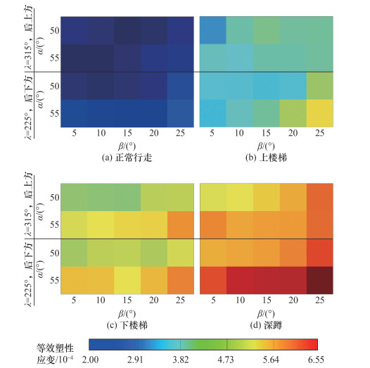 | 图 11 高边衬垫在4种步态下的等效塑性应变(衬垫安装位置都为α=55°,β=25°,λ=225°) |