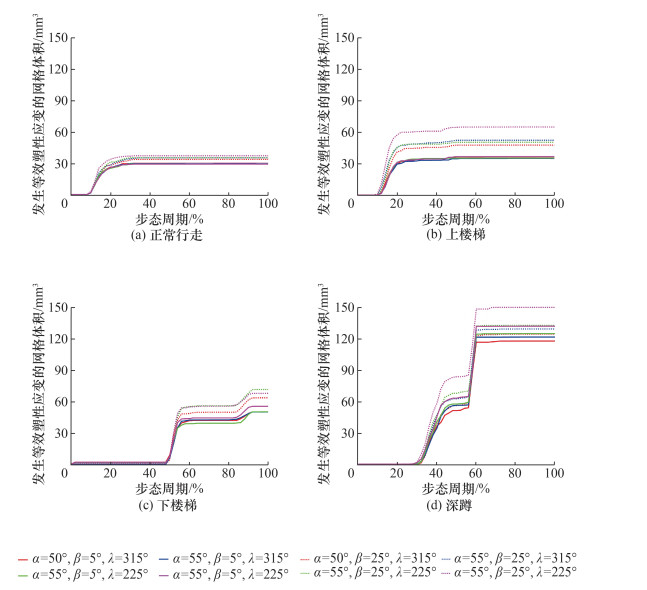 | 图 13 衬垫在不同步态和安装位置下等效塑性应变的体积随步态周期的变化关系 |