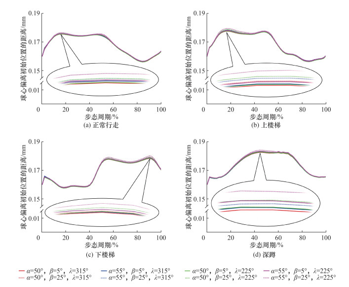2.3 高边衬垫的等效塑性应变图 11展现了高边衬垫的等效塑性应变区域,该区域主要集中在人体内上侧,而且深蹲步态的等效塑性应变区域和最大值明显大于另外3种步态。在图 12和图 13中,4种步态无论是高边衬垫等效塑性应变的最大值,还是等效塑性应变的有限元网格体积,从大到小排序都依次为深蹲、下楼梯、上楼梯和正常行走。深蹲步态的等效塑性应变的最大值为6.55×10-4,等效塑性应变的有限元网格体积最大值为150 mm3。衬垫的最大等效塑性应变值和等效塑性应变的有限元网格体积随臼杯外展角和前倾角增加而增加,深蹲步态的等效塑性应变从5.63×10-4变化到最大6.55×10-4,对应的衬垫位置从α=55°,β=5°,λ=225°变为α=55°,β=25°,λ=225°,高边置于人体后上方的等效塑性应变和等效塑性应变的有限元网格体积明显小于后下方。虽然衬垫边缘出现了边缘负载,但是没有发现塑性变形。另外,本文还统计了球头球心在不同步态和安装位置下相对于坐标原点的距离变化,该距离与步态载荷的合力存在明显的正相关关系,如图 14所示。球心离原点距离越大,衬垫形变就越大。在去除初始分析步中0.16 mm的位移后,4种步态下衬垫的形变量从大到小排序依次为深蹲、下楼梯、上楼梯和正常行走。