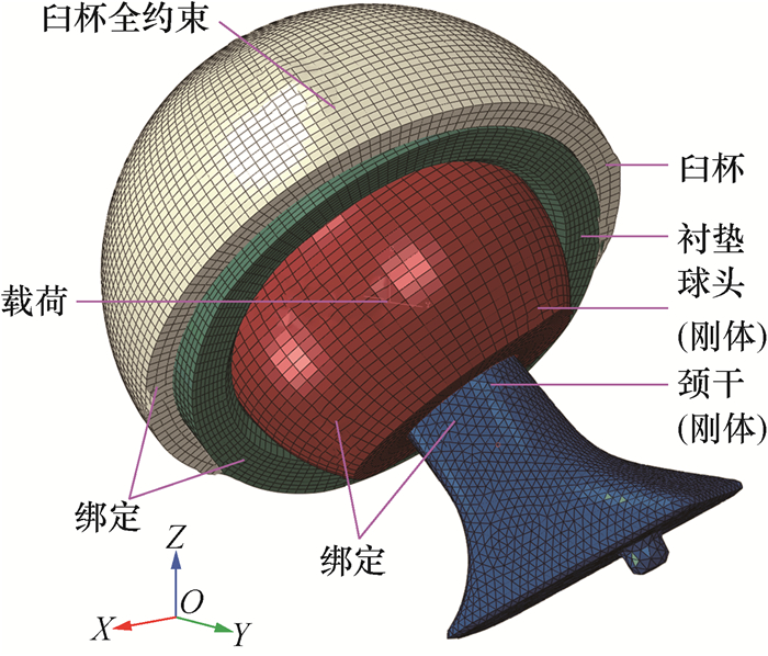 在Abaqus(V2018,达索SIMULIA公司)中建立髋关节假体有限元模型,如图 3所示。有限元模型由臼杯、衬垫、球头和颈干组成,球头直径为36 mm,衬垫与球头在半径方向上的间隙为0.15 mm,臼杯的厚度约3 mm。本文不关注颈干和球头的接触界面,而且球头和颈干的弹性模量远大于衬垫,因此将球头和颈干都当作刚体进行绑定处理。衬垫相对于臼杯的接触界面很难发生位移,因此将臼杯和衬垫的接触面进行绑定处理。臼杯与骨盆的相对位置不会发生变化,因此限制臼杯的所有自由度。在添加载荷之前,为使球头和衬垫接触,在球头球心添加了一个沿Y轴负方向0.16 mm的位移。