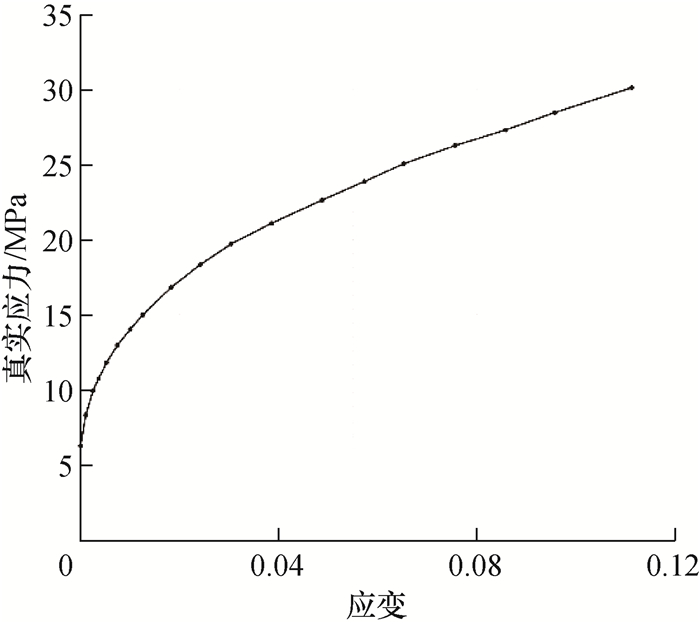 衬垫的材料为UHMWPE,臼杯的材料为钛合金(Ti6Al4V),球头和颈干的材料为CoCr合金,假体材料属性及参数如表 2所示。其中,UHMWPE是弹塑性材料[21-22],其塑性阶段的真实应力-应变曲线如图 4所示,衬垫和球头之间的摩擦系数为0.08[23]。