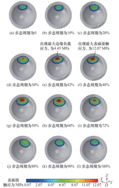 | 图 6 高边衬垫在整个深蹲步态下的表面接触应力变化情况(衬垫安装位置为α=55°,β=25°,λ=225°) |