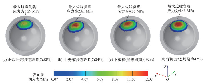 Hua等[3]研究发现人体从站姿到坐姿、从坐姿到站姿和站姿状态下衬垫边缘很难产生边缘负载,因此本模型没有采用这3种步态。有限元模型的步态载荷来自文[24-25]的研究结果,分别是正常行走、上楼梯、下楼梯和深蹲,如图 5所示。以左髋为研究对象,正常行走、上楼梯和下楼梯的起始位置分别为左腿脚后跟着地、左腿脚后跟着地和左腿脚尖处于最高位置。载荷的加载位置为球头的球心处(见图 3),人体体重设定为75 kg。3个方向的分力沿3个坐标轴方向加载在球心上,屈曲运动和外展运动分别绕Y轴和X轴进行。
