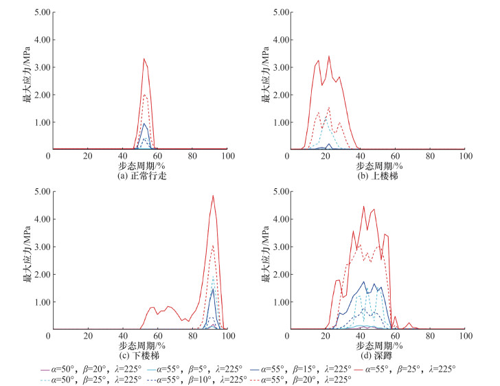 在相同安装位置下,下楼梯和深蹲步态发生边缘负载处的最大表面接触应力值和边缘负载的持续时间明显大于正常行走和上楼梯步态(见图 9和10),下楼梯和深蹲步态的发生边缘负载处的最大表面接触应力值分别能达到4.85和4.45 MPa。深蹲步态发生边缘负载处的表面接触应力值不但高,而且持续时间普遍比另外3种步态长。图 10中,边缘负载的持续时间随α和β增加而增加,正常行走、上楼梯、下楼梯和深蹲步态的边缘负载时间占比分别从0、0、2%、22%增加到14%、50%、34%、54%,对应的衬垫位置从α=55°,β=5°,λ=225°变为α=55°,β=25°,λ=225°。与同内径的平边衬垫相比,将高边衬垫的高边置于人体后上方可避免出现边缘负载。