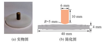 根据人工关节的结构和运动形式,对人工关节配副材料的摩擦磨损实验进行简化,采用球-盘接触形式,如图 1所示,选择PEEK和XLPE作为实验用销和盘。XLPE(跨骏塑胶贸易有限公司,密度945 g/cm3)加工为一个尺寸为40 mm×4 mm的圆盘,然后抛光至表面粗糙度小于0.2 μm,以满足人工关节表面粗糙度要求。PEEK销(苏州中科生物医用材料,表面粗糙度小于0.1 μm)的尺寸为6 mm×10 mm×10 mm,其圆弧部分对应半径R为5 mm的球。