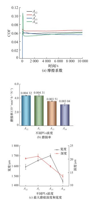 | 图 10 PEEK-XLPE配副材料在不同PLs浓度复合滑液中的摩擦磨损结果 |
