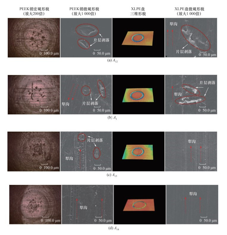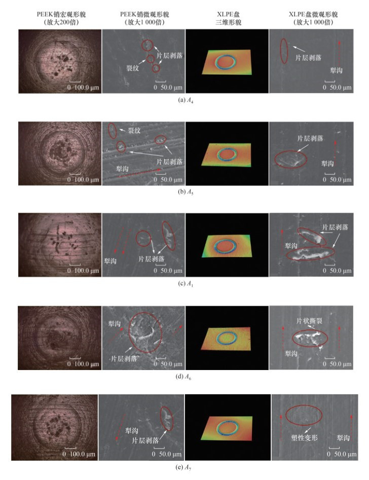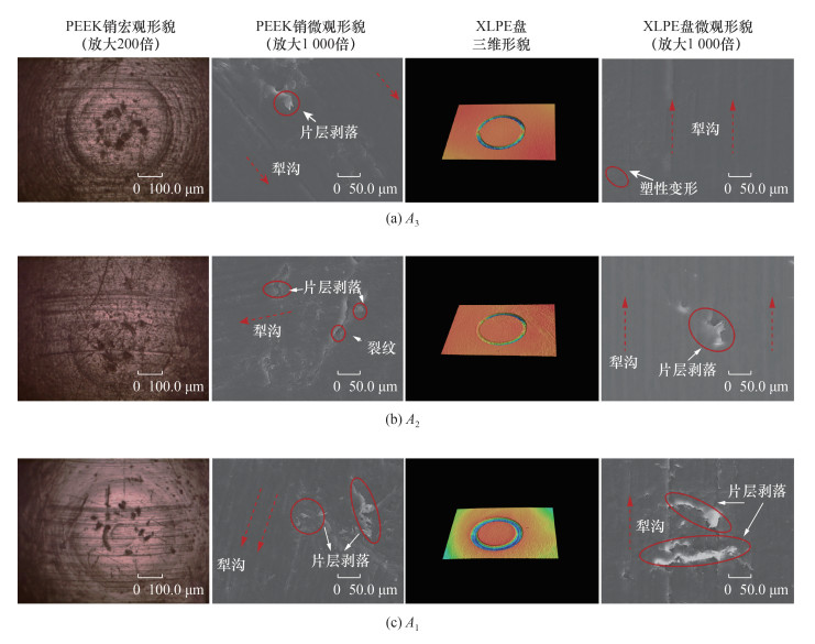 实验后采用高速数码显微摄像机观察磨损区域的宏观磨损形貌;通过三维轮廓测量仪和数字显微镜表征磨痕的整体和局部三维形貌,并对其磨痕截面和磨痕轮廓进行数据分析,获得接触面的磨损率和最大磨痕深度及宽度;利用扫描电子显微镜观察磨痕的微观形貌,探究PEEK-XLPE配副材料的磨损机理。