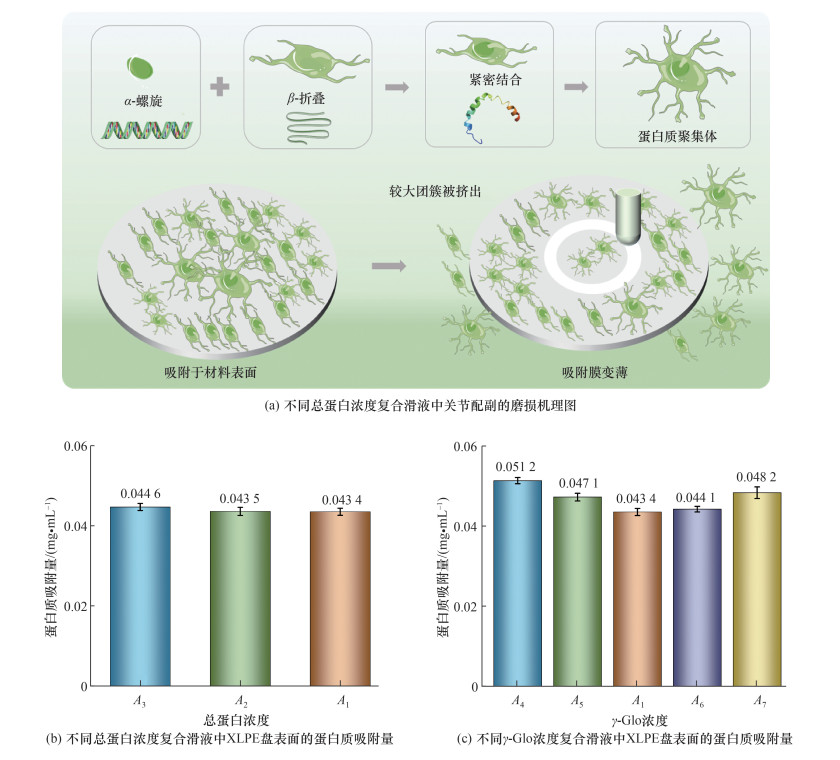 2.1节中的结果表明,随着总蛋白浓度增加,XLPE盘和PEEK销的磨损加剧。不同总蛋白浓度复合滑液中PEEK-XLPE配副材料摩擦磨损的影响机制如图 16a所示。由于Alb的特征二级结构为α-螺旋结构,γ-Glo的特征二级结构是β-折叠结构,这2种蛋白质间的作用增强了蛋白质与材料表面之间的吸附作用,导致蛋白质聚集,形成聚集体[23]。因此,复合滑液中总蛋白浓度越高,形成的团簇越大,较大的团簇更易从配副材料的接触中心挤出,导致吸附膜厚度减小,从而使磨损加剧。图 16b和16c分别为不同总蛋白浓度及不同γ-Glo浓度复合滑液中摩擦磨损测试后XLPE盘表面的蛋白质吸附量。可以看出,随着总蛋白浓度增加,XLPE盘表面蛋白质吸附量逐渐减小,因此可以推断吸附膜厚度减小,进而导致磨损程度增加。XLPE盘表面蛋白质吸附量随着γ-Glo浓度增加先增大后减小,γ-Glo浓度为8.75 mg/mL时蛋白质吸附量最小,与PEEK销和XLPE盘的摩擦磨损结果相对应,此时磨损最严重(见图 16c),表明复合滑液组分中γ-Glo浓度对关节配副材料的摩擦磨损影响较大,γ-Glo浓度变化会改变Alb与γ-Glo的浓度比,合适的Alb与γ-Glo的浓度比影响蛋白质的吸附能力。随着Alb与γ-Glo的浓度比降低,磨损率先增大后减小。由于复合滑液中Alb与γ-Glo的浓度比不合适,2种蛋白质在摩擦表面之间产生不良黏附作用,磨损加剧[24]。蛋白质对人工关节的摩擦和磨损影响主要体现在总蛋白浓度及Alb与γ-Glo的浓度比两者会影响蛋白质的吸附膜厚度,吸附膜增厚可以减轻人工关节的摩擦和磨损。