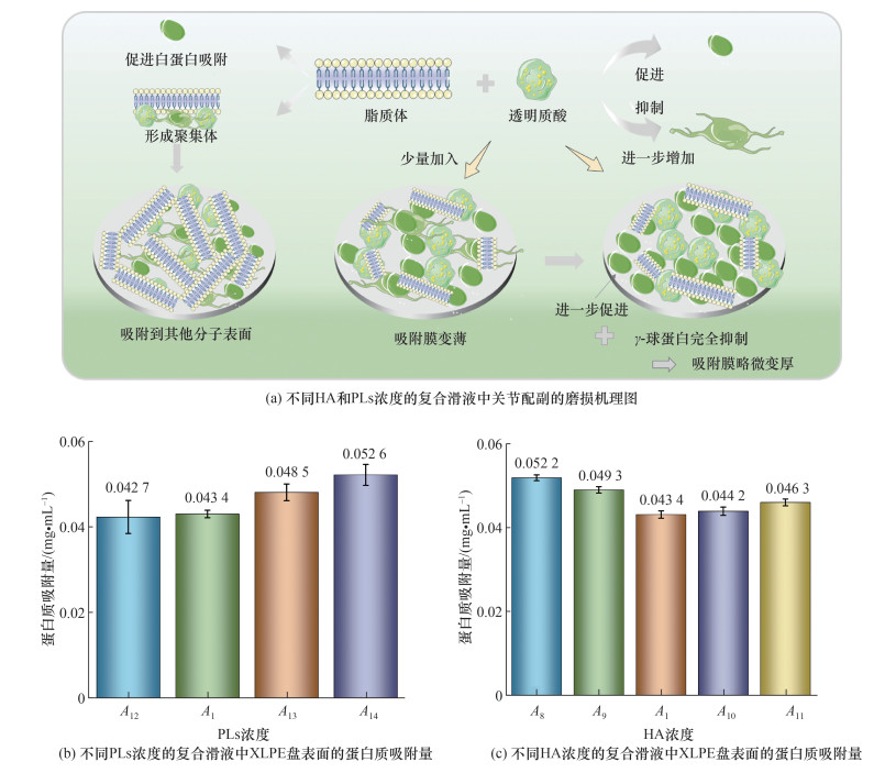 图 17a为不同HA和PLs浓度的复合滑液中PEEK-XLPE配副材料摩擦磨损机理图。随着PLs浓度增加,配副材料磨损程度整体呈下降趋势。主要原因如下:PLs有疏水脂肪酸,具有较好的润滑作用[25];当PLs浓度增加时,Alb薄膜厚度增加[15],γ-Glo薄膜厚度几乎没有变化,而且PLs能促使γ-Glo薄膜均匀且稳定,从而降低配副材料的磨损程度。此外,PLs易吸附于其他分子表面或与其他分子聚合,摩擦副在脂质双分子层之间滑动以减小摩擦[26]。图 17b为不同PLs浓度的复合滑液中XLPE盘表面蛋白质吸附量的变化。可以看出,随着PLs浓度增加,XLPE盘表面的蛋白质吸附量不断增大,进一步证明加入PLs能够促进Alb吸附,使吸附膜增厚。随着HA浓度增加,磨损率先增大后减小,造成这种现象的原因是蛋白质混合液中同时加入HA和PLs,能促进Alb吸附而抑制γ-Glo吸附[23]。由于γ-Glo的体积远远大于Alb,能够形成更厚的吸附膜,因此加入HA会使吸附膜变薄。而且随着HA浓度增加,HA对γ-Glo吸附的抑制作用进一步增强,使吸附膜变薄,从而加剧磨损。当HA浓度进一步增加时,γ-Glo几乎被完全抑制,剩余的HA进一步促进Alb吸附,使吸附膜略微增加,磨损略微减轻。图 17c为不同HA浓度的复合滑液中摩擦磨损测试后XLPE盘表面的蛋白质吸附量,随着HA浓度增加,XLPE盘表面的蛋白质吸附量呈先减小后增大的趋势,在HA浓度为1.0 mg/mL时蛋白质吸附量最小,此时XLPE盘的磨损程度最严重,也进一步验证4种成分协同作用关系对吸附膜厚度的影响。PLs和HA对蛋白膜厚度的影响可能基于一种新的组分分层润滑模型,即γ-Glo先吸附到材料表面,HA和PLs使γ-Glo层均匀且稳定,之后低抗剪切的Alb吸附到γ-Glo层上,增加润滑层厚度,从而改善人工关节的摩擦磨损[7]。