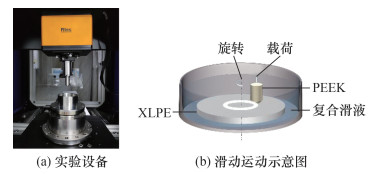 摩擦磨损实验在MFT-5000型多功能摩擦实验机上进行,实验采用球-盘点接触模块,先在圆盘驱动模块上安装圆形夹具,再将XLPE盘安装在圆形夹具中,PEEK销通过销孔固定。在摩擦磨损实验过程中,PEEK销通过上夹具进行固定并保持不动,XLPE盘则在电机驱动下随圆盘驱动模块进行旋转运动,从而实现球-盘点接触的纯滑动摩擦运动,实验设备和滑动运动示意图如图 3所示。将人工关节复合滑液放置在圆形夹具中,本实验共进行14组复合滑液的摩擦磨损实验,每组平行实验重复开展3次。根据人工髋关节的动力学分析与髋臼和股骨头之间的运动速度范围[17, 21-22],确定球-盘之间的滑动速度为2 rad/s,接触载荷为50 N。