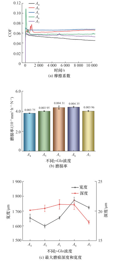 | 图 7 PEEK-XLPE配副材料在不同γ -Glo浓度复合滑液中的摩擦磨损结果 |
