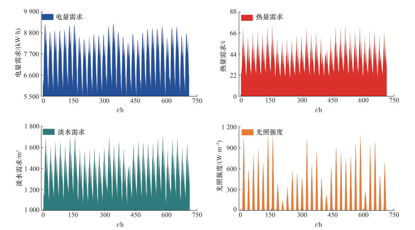 如图 3所示,用户需求在全年各季和各小时之间都存在波动。由于柔性设计模型复杂,为节约计算时间和提高准确性,本文在图 3所示的全年中选取一个典型月作为柔性设计阶段所用案例。如图 4所示,该典型月案例在150~250 h、380~420 h和590~620 h时段光照条件较差,其他时段光照强度能够在正常强度范围内规律波动或强于正常强度,这说明典型月案例能够涵盖光照正常时段、光照连续充足时段及光照连续不足时段3种情况,即典型月案例能够依据复杂天气状况条件来检验设计所得系统的柔性能力强弱。
