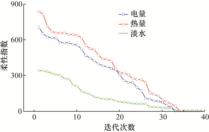 如图 6所示,以固定工况设计的系统规模作为柔性设计过程的初始系统规模,电能、热能和淡水的初始柔性指数分别为704.36、839.61和341.55。模型在计算时设置约束极限值(1±0.05)及各变量初始改变步长为2.5%,最大迭代次数为50次。共进行39次迭代计算,通过对边界约束及其对应变量的不断优化,各柔性指数的值逐渐变小,在第34次时各柔性指数收敛为0且后续迭代不再发生变化,此时系统模型中的边界约束得以检测并被解除,系统规模更加合理,在典型月中各时刻均能符合供能约束,说明此时系统的柔性能力得到较大提升。