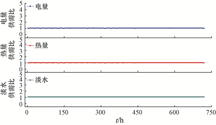 如图 7所示,柔性设计所得系统在典型月未出现供需异常时刻。淡水供需比在典型月各时刻稳定保持在1.05,电能供需比和热能供需比虽仍存在一定程度的波动,但均处在0.95~1.05的供能要求之内。在天气状况较差的150~450 h时段,由于系统的能量调控能力提高,系统仍能稳定满足能量需求,说明根据柔性设计方法得到的联产系统在复杂天气状况下稳定供能能力明显增强,同时系统产能波动也被显著抑制。