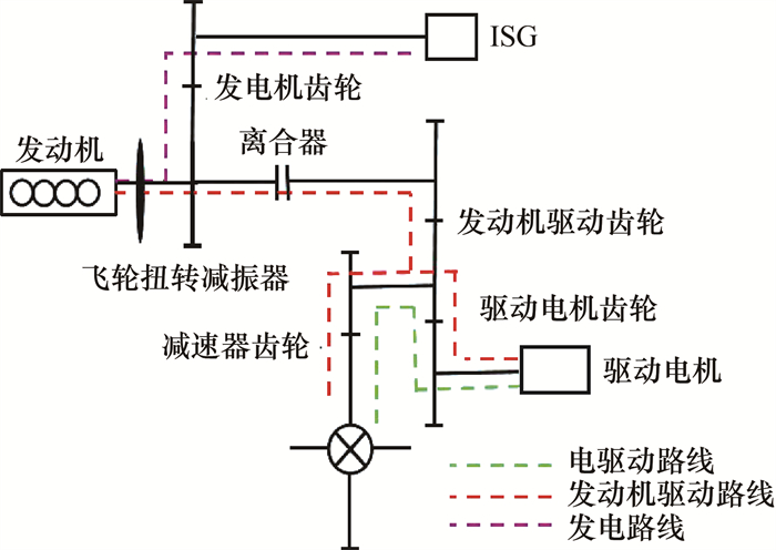 随着混合动力车辆在国内的销量提升,用户对低噪声、低振动和高舒适性的需求越来越高,因此发动机抖动问题受到越来越多的关注。发动机的抖动问题多出现在发动机启动时刻,传统燃油车的发动机在原地启动后始终保持运行,产生的抖动影响较小;而混合动力车内的发动机启动时刻由整车控制策略决定,发动机启动时刻不仅会在原地启动工况出现,也会在加速工况出现,尤其是在电池电量较低、城市路况拥堵的情况下行驶时,为保持电池电量,发动机会频繁地由电动车(electric vehicles, EV)模式切换为混动车(hybrid electric vehicles, HEV)模式,让发动机介入发电。与燃油车相比,混动车因发动机介入而引起抖动问题出现的概率大,更易导致驾乘体验感下降。因此,研究混动车发动机介入抖动机理和解决方案,成为近年来国内外学者的热门研究课题。